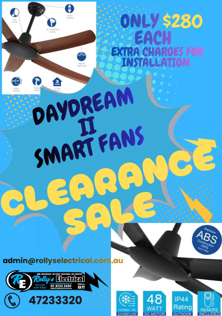 This Stylish 5 bladed, smart, WIFI DC fan looks the part and does the job. With a massive 13,592 m3/hr airflow rating, you’ll stay cool this summer. Remote controlled and compatible with your smart home. Made from Premium ABS the Daydream II, will stay 100% Rust Free forever. On Sale Until all Stock is gone $280 each unit plus Installation.
